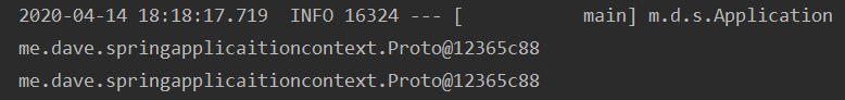 @Component public class AppRunner implements ApplicationRunner { @Autowired Single single; @Autowired Proto proto; public void run(ApplicationArguments args) throws Exception { System.out.println(proto); //AppRunner에 주입받은 Proto bean System.out.println(single.getProto()); //Single에 주입 받은 Proto bean } }위의 코드를 실행해보면 다음과 같이 Single에서 주입받은 Proto bean과 AppRunner에서 주입받은 Proto bean이 동일한 bean임을 확인할 수 있습니다.