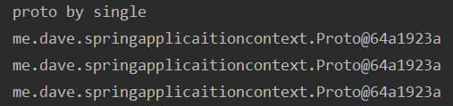 @Component public class AppRunner implements ApplicationRunner { @Autowired ApplicationContext ctx; public void run(ApplicationArguments args) throws Exception { System.out.println("proto"); System.out.println(ctx.getBean(Proto.class)); System.out.println(ctx.getBean(Proto.class)); System.out.println(ctx.getBean(Proto.class)); System.out.println("single"); System.out.println(ctx.getBean(Single.class)); System.out.println(ctx.getBean(Single.class)); System.out.println(ctx.getBean(Single.class)); System.out.println("proto by single"); System.out.println(ctx.getBean(Single.class).getProto()); System.out.println(ctx.getBean(Single.class).getProto()); System.out.println(ctx.getBean(Single.class).getProto()); } }예상한 대로 주입받은 prototype scope의 bean이 3회 사용되었지만 한 번만 생성된 것을 확인할 수 있습니다.