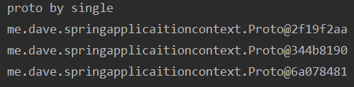 @Component public class AppRunner implements ApplicationRunner { @Autowired ApplicationContext ctx; public void run(ApplicationArguments args) throws Exception { System.out.println("proto"); System.out.println(ctx.getBean(Proto.class)); System.out.println(ctx.getBean(Proto.class)); System.out.println(ctx.getBean(Proto.class)); System.out.println("single"); System.out.println(ctx.getBean(Single.class)); System.out.println(ctx.getBean(Single.class)); System.out.println(ctx.getBean(Single.class)); } }위의 코드를 실행해보면 예상했던 것과 동일한 결과가 나오는 것을 확인할 수 있습니다.