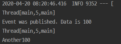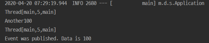 @Component public class MyEventHandler { @EventListener public void handler(MyEvent event) { System.out.println(Thread.currentThread().toString()); System.out.println("Event was published. Data is " + event.getMyData()); } }실행해보면 두 handler 모두 동일한 thread에서 순차적으로 실행됨을 확인할 수 있습니다.