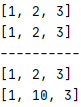 from copy import deepcopy L1 = [1, 2, 3] L2 = deepcopy(L1) print(L1) print(L2) print('----------') L2[1] = 10 print(L1) print(L2)다음은 위의 코드를 실행한 결과다. L1과 L2과 별개의 객체로 인식되고 있음을 알 수 있다.