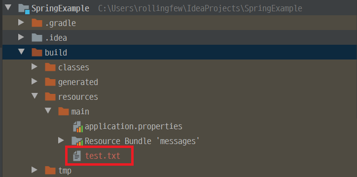 resources directory 아래에 test.txt file을 생성하고 project를 build하면 target directory 안으로 들어갑니다. 즉, classpath에 들어가게 됩니다.