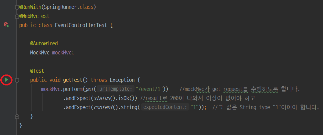 @RunWith(SpringRunner.class) // ① @WebMvcTest // ② public class EventControllerTest { @Autowired MockMvc mockMvc; // ③ @Test public void getTest() throws Exception { mockMvc.perform(get("/event/1")) // ④ .andExpect(status().isOk()) // ⑤ .andExpect(content().string("1")); // ⑥ } }① test할 때 JUnit 내장 runner 대신 SpringRunner.class를 사용하도록 지정합니다.