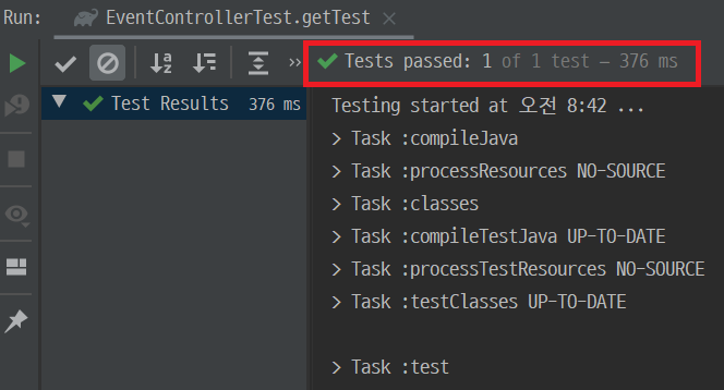 - EventController를 test할 code를 추가합니다. 통상 class명 뒤에 "Test"를 붙인 형태로 class를 만들어 줍니다.