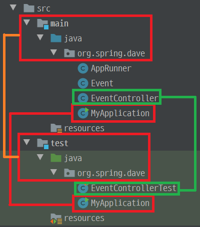 - SRC 아래로 main과 test directory가 있는데 두 directory의 package를 동일한 형태로 맞춰줍니다.
