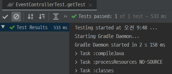@RunWith(SpringRunner.class) @WebMvcTest public class EventControllerTest { @Autowired MockMvc mockMvc; @Test public void getTest() throws Exception { mockMvc.perform(get("/event/1")) .andExpect(status().isOk()) .andExpect(content().string("1")); } }test가 다음과 같이 통과됩니다.