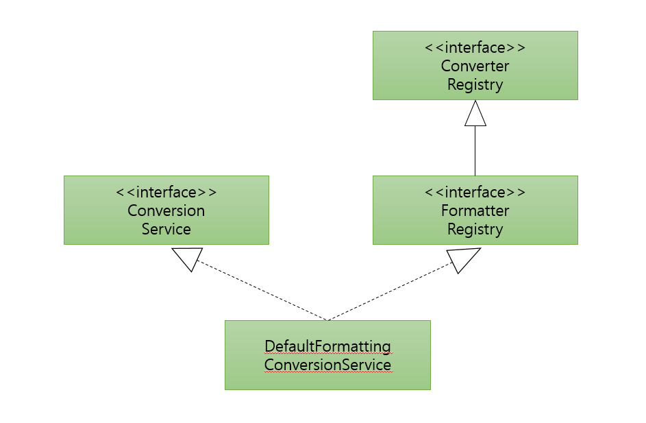 ConversionService interface의 구현체로 제공되는 DefaultFormattingConversionService class가 있는데, ConversionService 뿐 아니라 ConverterRegistry, FormatterRegistry interface도 구현하고 있어 이 class를 사용하여 편리하게 data binding 할 수 있습니다. 보통 ConversionService type의 bean으로 DefaultMormattingConversionService class의 객체를 등록하여 사용합니다. DefaultMormattingConversionService는 여러가지 기본 converter와 formatter를 사용할 수 있도록 등록해줍니다. 위의 예제에서 살펴본 String <-> Object 간의 data binding은 기본으로 등록되어있는 converter 또는 formatter를 사용하여 처리할 수 있습니다. (converter와 fomatter의 예를 들기 위해 살펴본 것이지 제공되고 있는 것을 다시 만들 필요는 없습니다.)