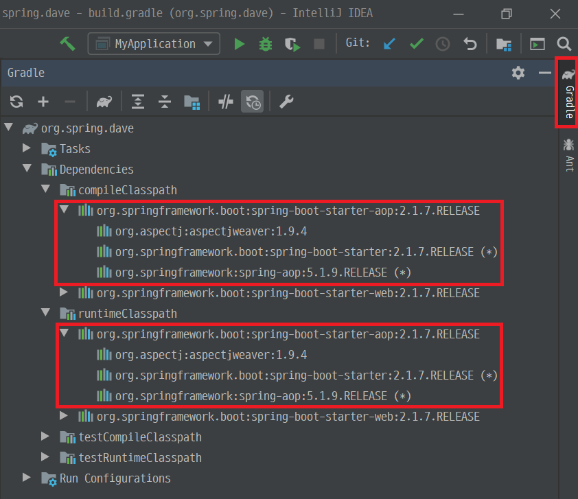 buildscript { ext { springBootVersion = '2.1.7.RELEASE' } repositories { mavenCentral() jcenter() } dependencies { classpath("org.springframework.boot:spring-boot-gradle-plugin:${springBootVersion}") } } apply plugin: 'java' apply plugin: 'eclipse' apply plugin: 'org.springframework.boot' apply plugin: 'io.spring.dependency-management' group 'org.example' version '1.0-SNAPSHOT'+new Date().format("yyyyMMddHHmmss") sourceCompatibility = 1.8 repositories { mavenCentral() jcenter() } dependencies { implementation 'org.springframework.boot:spring-boot-starter-web' implementation 'org.springframework.boot:spring-boot-starter-aop' //AOP 의존성 추가 testImplementation 'org.springframework.boot:spring-boot-starter-test' testImplementation 'org.assertj:assertj-core:3.12.2' }이후 Control + Shift + 0으로 gradle 변경사항을 적용한 후 build가 끝나면 아래 그림과 같이 AOP 관련 의존성이 잘 들어왔는지 확인해 봅니다.