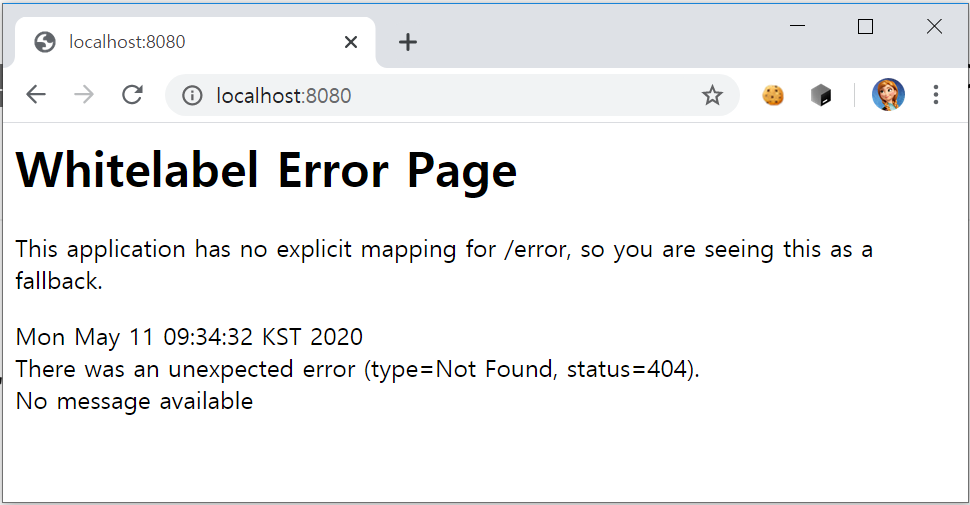 실제 service되고 있는지 Browser를 통해 localhost로 접근해보면 Whitelabel Error Page가 뜨는데, 이는 내장 WAS가 기동 되고 있다는 뜻입니다.