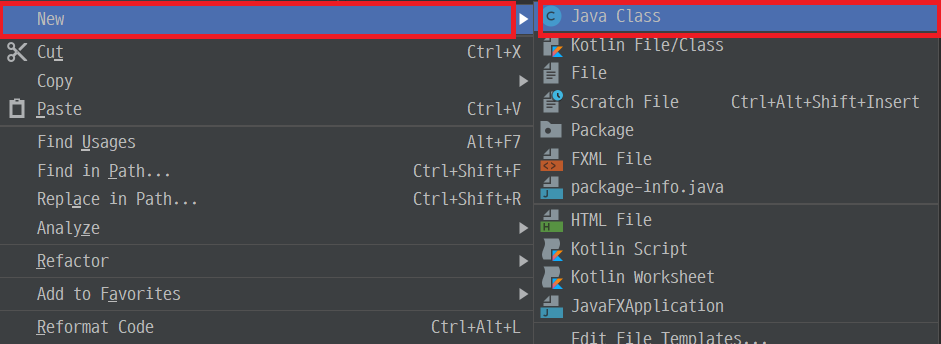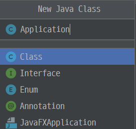 class 생성 생성할 class는 기동을 위한 main함수를 지니고 있는 class로, class명은 자유롭게 정해도 되지만 통상 application임을 나타내도록 명명합니다. 여기서는 "Application"으로 명명하여 만들겠습니다.