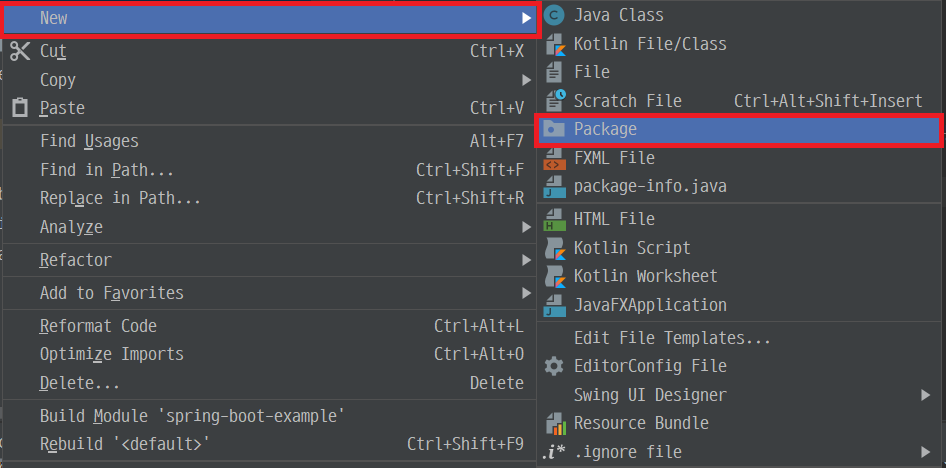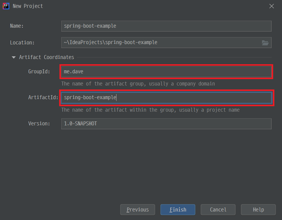 package 생성 package명은 project 생성시 사용한 GroupId를 그대로 사용하시면 됩니다. 여기서는 "me.dave"가 되겠습니다.