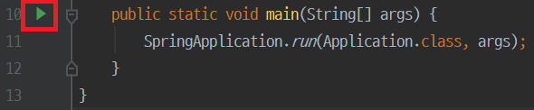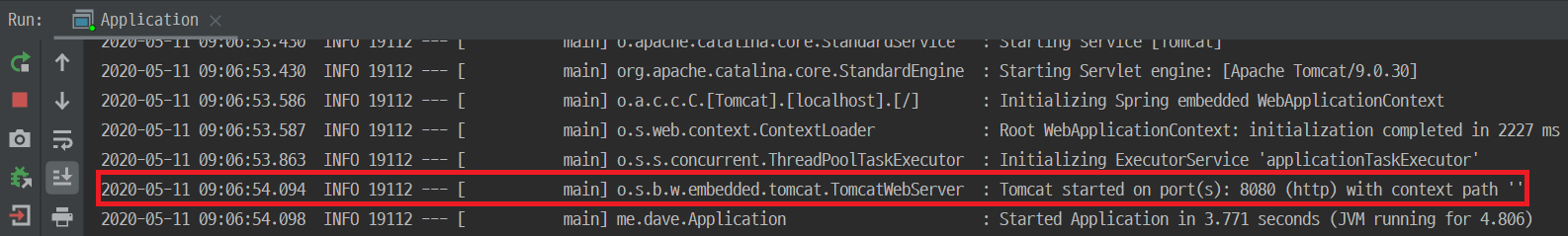 package me.dave; import org.springframework.boot.SpringApplication; import org.springframework.boot.autoconfigure.SpringBootApplication; @SpringBootApplication public class Application { public static void main(String[] args) { SpringApplication.run(Application.class, args); } }main 함수 앞에 있는 ▶ button을 클릭하거나 Shift+F10으로 project를 실행합니다.