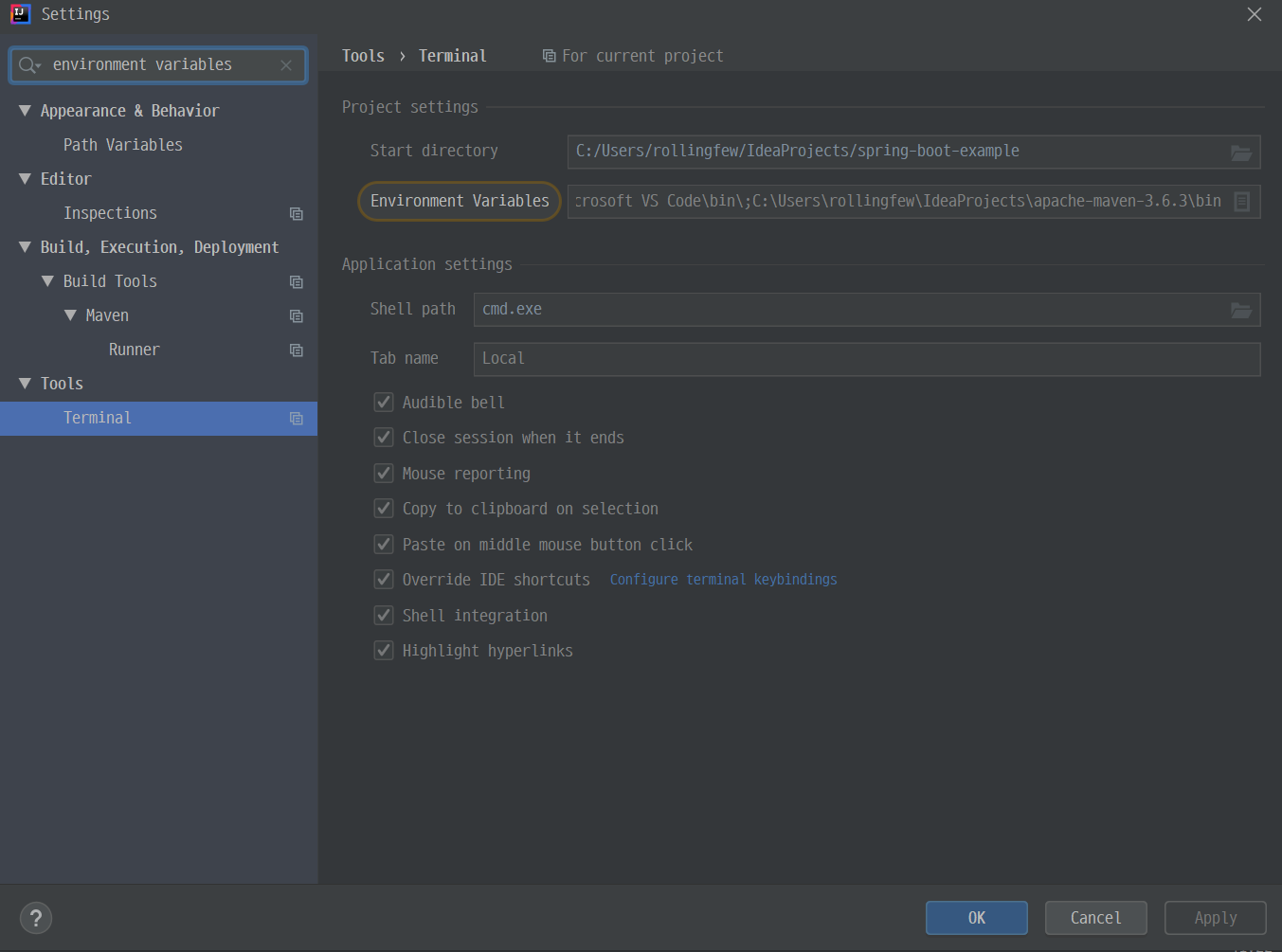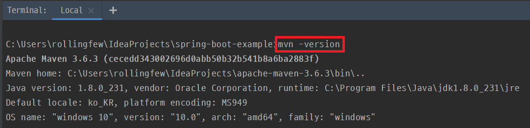 System 환경변수 path에 maven path 추가 이제 IntelliJ terminal에서 다음과 같이 maven을 사용할 수 있는 상태가 되었습니다.