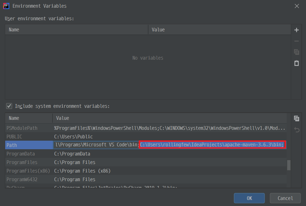 System 환경변수 중 path 값 마지막에 maven directory 하위의 bean directory까지 포함한 경로를 추가해 줍니다.