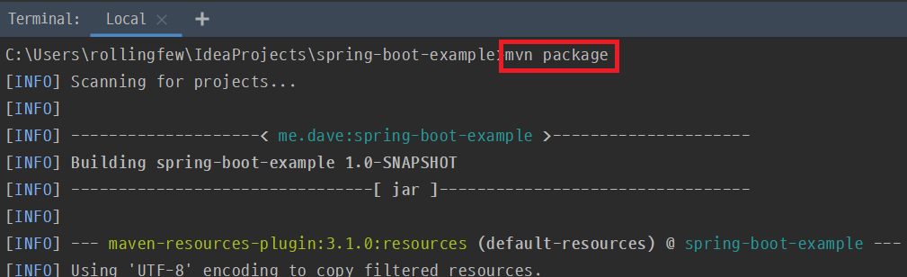 maven을 사용해 현재 project를 실행할 수 있는 Jar file로 만들 수 있습니다. terminal에서 maven project의 root로 이동한 뒤에 "mvn package" 명령으로 Jar file을 생성합니다.