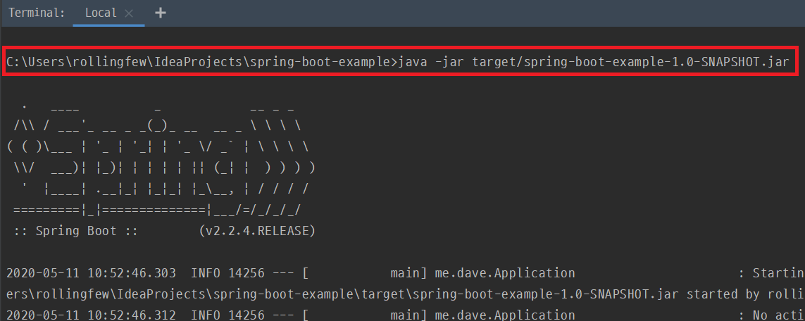 Jar file은 project의 target directory에 생성되며 java -jar 명령으로 jar를 실행할 수 있습니다.