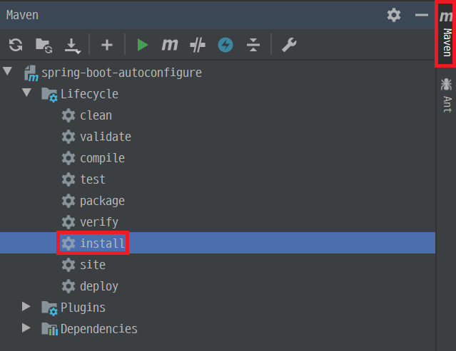 6. Project A의 auto configuration을 다른 project에서도 사용할 수 있도록 Project A를 build 해서 jar file형태로 maven repository에 install 합니다. maven install은 maven tab의 Lifecycle 중 install을 double click 하거나 terminal에서 Project A 경로로 두고 mvn install 명령어를 입력하여 실행할 수 있습니다.
