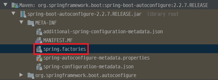 Spring boot의 autoconfiguration file은 External Libraries 중 spring-boot-autoconfigure-X.X.X.RELEASE/META-INF/spring.factories file 입니다.