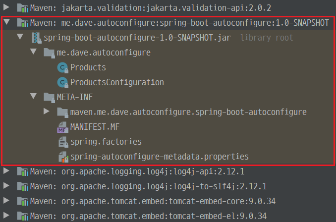 org.springframework.boot.autoconfigure.EnableAutoConfiguration=\ me.dave.autoconfigure.ProductsConfiguration위에 기술된 spring.factories file 내용은 auto configuration이 enable이면 me.dave.autoconfigure.ProductsConfiguration java 설정 file을 사용해서 bean을 등록하라는 것입니다.