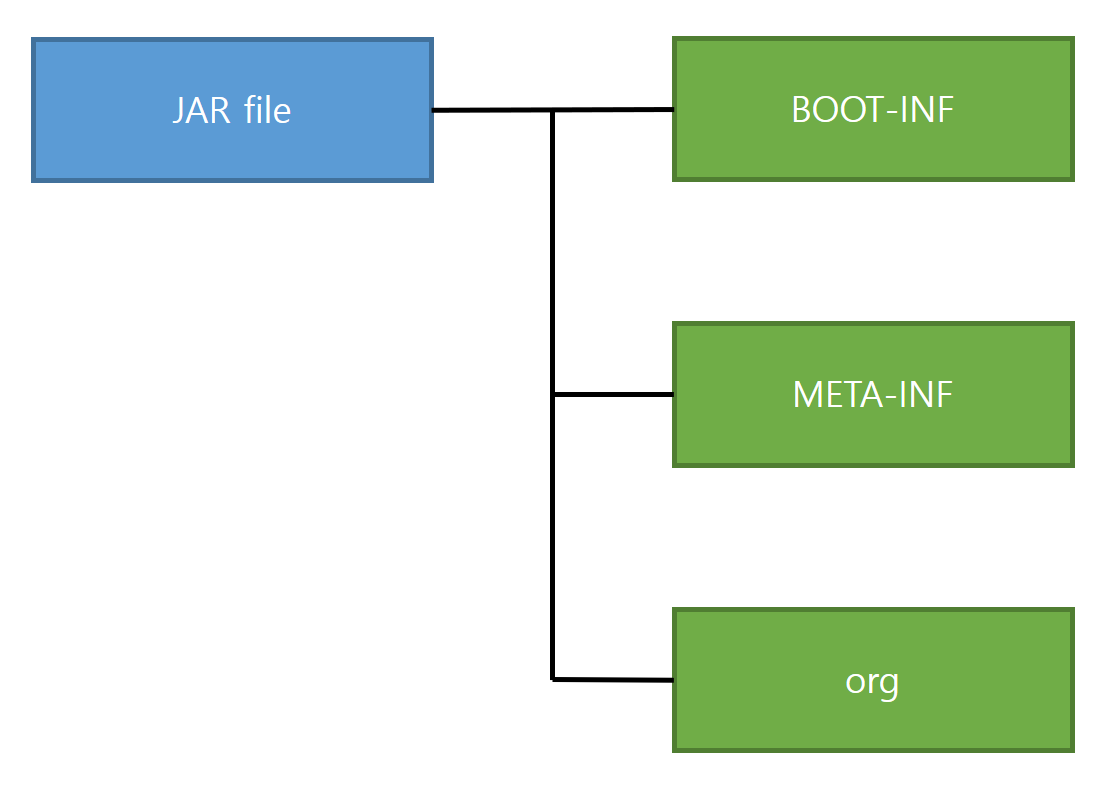 Jar file directory 구조 실행 가능한 Jar file의 압축을 풀어보면 BOOT-INF/lib 안에 Jar file 형태로 external library들이 포함돼 있기 때문에 모든 의존성을 받아 실행할 수 있게 됩니다. Spring boot는 loader(org.springframework.boot.loader.jar.JarFile)를 사용하여 실행 가능한 Jar file 안에 포함된 external library에 해당하는 Jar file을 읽어옵니다.