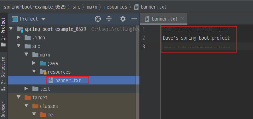 만약 /src/main/resources 외에 다른 path에 banner file을 넣고 싶은 경우에는 다음과 같이 application.properties file에 spring.banner.location key에 classpath 기준의 banner file path를 value로 입력해줍니다.