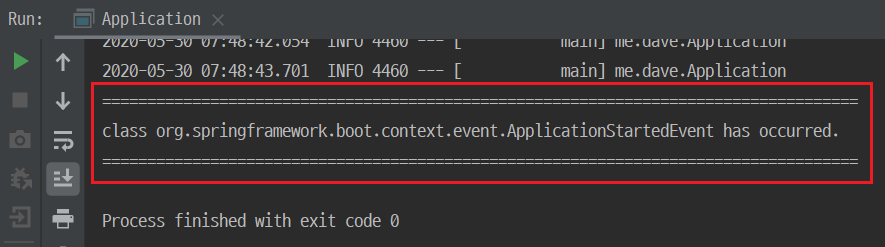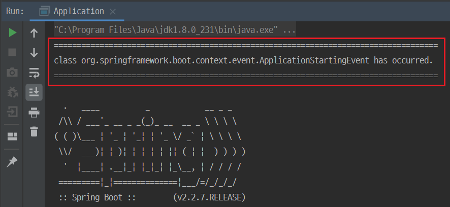 위의 code를 실행하면 spring application이 실행될 때 ApplicationStarting event가 발생하며 이에 대한 listener가 동작하여 console에 그 실행 결과가 출력됩니다.