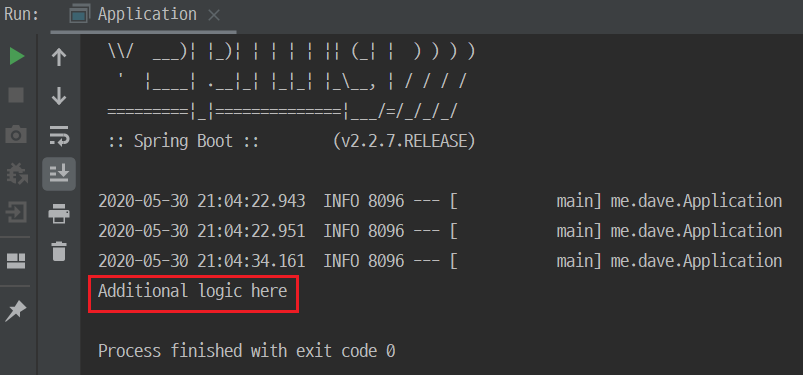 @Component public class AppRunner implements ApplicationRunner { @Override public void run(ApplicationArguments args) throws Exception { System.out.println("Additional logic here"); } }application을 실행한 결과를 보면 추가로 실행하기 원하는 logic이 실행 되었음을 확인할 수 있습니다.