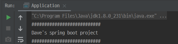 @SpringBootApplication public class Application { public static void main(String[] args) { SpringApplication app = new SpringApplication(Application.class); app.setWebApplicationType(WebApplicationType.NONE); app.setBanner(new Banner() { // ① @Override public void printBanner(Environment environment, Class<?> sourceClass, PrintStream out) { out.println("###########################"); out.println("Dave's spring boot project "); out.println("###########################"); } }); app.run(args); } }① Banner 객체를 생성하고 printBanner() method를 overriding하는 것으로 custom한 banner를 출력합니다. 단, banner file이 있는 경우에는 file을 우선하여 banner로 사용합니다.