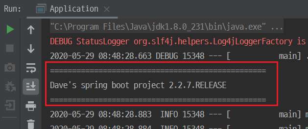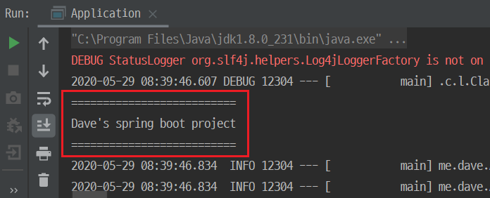 @SpringBootApplication public class Application { public static void main(String[] args) { SpringApplication app = new SpringApplication(Application.class); app.setWebApplicationType(WebApplicationType.NONE); app.setBanner(new Banner() { // ① @Override public void printBanner(Environment environment, Class<?> sourceClass, PrintStream out) { out.println("###########################"); out.println("Dave's spring boot project "); out.println("###########################"); } }); app.run(args); } }① Banner 객체를 생성하고 printBanner() method를 overriding하는 것으로 custom한 banner를 출력합니다. 단, banner file이 있는 경우에는 file을 우선하여 banner로 사용합니다.