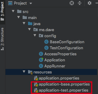 각 profile 전용으로 properties file을 만들어 두고 해당 profile이 적용될 때만 profile에 해당하는 properties file의 key에 접근할 수 있습니다. profile 전용의 properties file의 이름은 application-{profile_name}.properties 형태로 지정하면 spring boot에서 자동으로 인식하게 되어있습니다. base, test profile에 해당하는 properties file을 생성하여 profile에 따라 properties file이 선택되는지 확인해보도록 합시다.