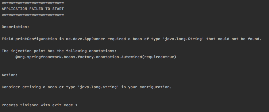 @Component public class AppRunner implements ApplicationRunner { @Autowired private String printConfiguration; @Override public void run(ApplicationArguments args) throws Exception { System.out.println("============================="); System.out.println(printConfiguration); System.out.println("============================="); } }application을 실행해보면 특정 bean이 없어 application을 시작할 수 없다는 message를 보여줍니다. @Autowired로 주입하려는 bean에 profile이 적용된 상태이기 때문에 현재는 주입할 수 있는 bean이 없기 때문입니다.