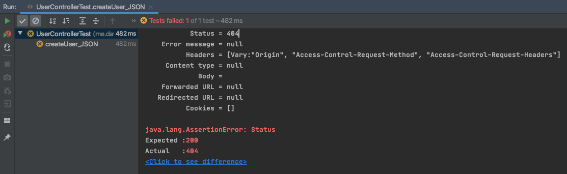 우선 test code를 실행해봅니다. 아직 "/users/create" URI에 post request를 처리할 수 있는 controller bean을 만들어 놓지 않은 상태이기 때문에 404 error를 보면서 test를 실패하게 됩니다.