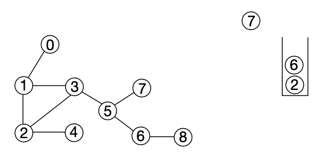6. 스택에서 노드 7을 팝한다. 인접한 노드 중 스택에 들어간 이력이 없는 노드가 없으므로 푸쉬는 발생하지 않는다.