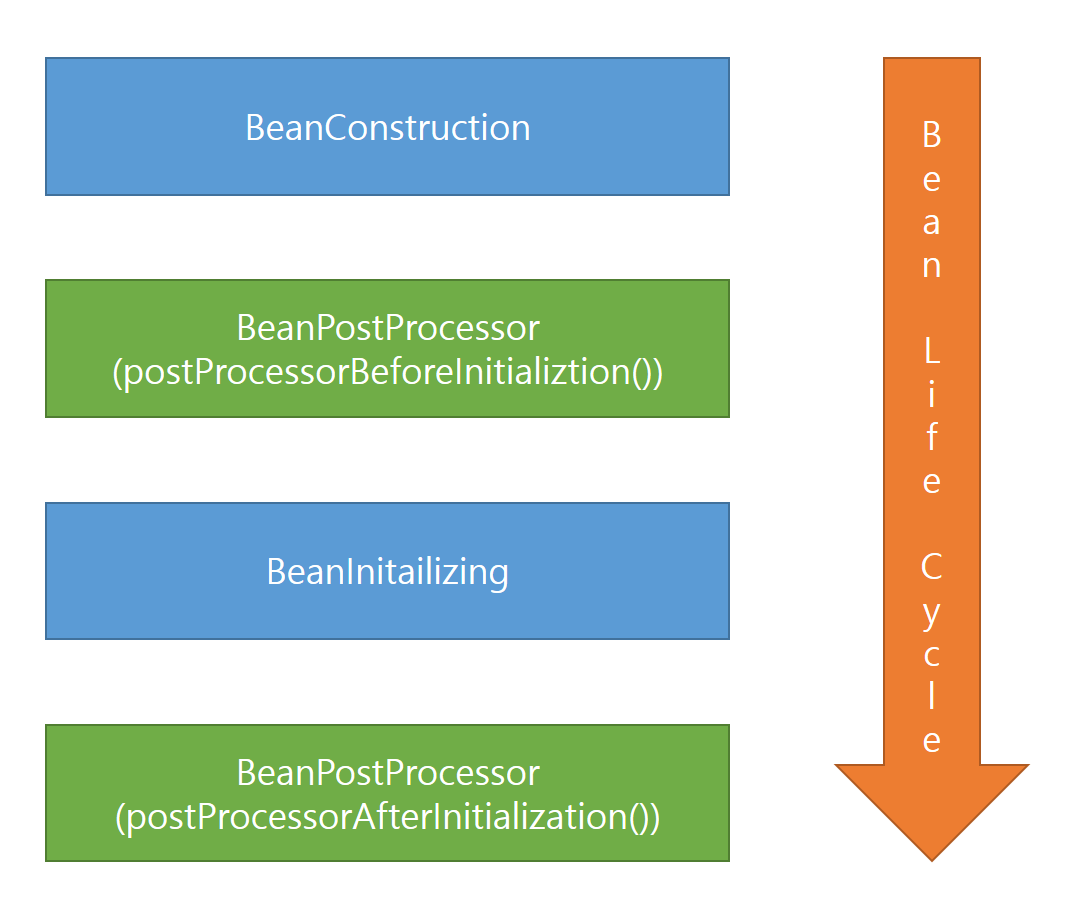다음 그림은 Bean life cycle의 일부입니다. life cycle의 진행에 따라 먼저 Bean이 생성되고 Bean Initializing 전 후로 BeanPostProcessor가 실행됨을 확인할 수 있습니다.